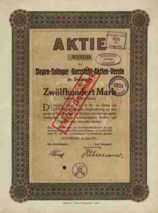 Am 23. Dezember 1872 von Solinger und Siegener Industriellen gegründet. Die „Gußstahl-Fabrik“, wie sie kurz im Volksmund genannt wurde, beschäftigte 1921 etwa. 4.000 Personen. Sitz bis 1.3.1924 in Solingen, danach Berlin, 1932 wieder in Solingen. Betrieb eines Edelstahlwerkes mit Stahlwerk, Stahlformgießerei, Dampfhammerwerk, vier Walzwerke, Walzendreherei, Rohrpress- und -ziehwerk, Präzisionsstangen- und Drahtzieherei, Kaltwalzwerk, sowie mechanische Werkstätten. Produziert wurde Gussstahl in Solingen, sowie in Frankleben, Wald (Rheinland) und Großkayna bei Merseburg. 1922 Übernahme der Weyersberg, Kirschbaum & Cie. (WKC). Am 29. Februar 1932 wurde das Konkursverfahren eröffnet. (Weltwirtschaftskrise). Produktionsteile konnten durch Ausgliederung an anderen Standorten weitergeführt werden, wie die Blankwaffenproduktion der WKC an der Wittkuller Straße in Wald.