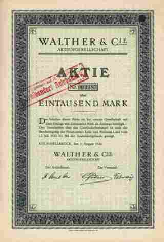 | Gegründet am 03.06.1874. Herstellung von Walther-Höchstdruckkesseln, Kohlenstaubfeuerungen, Rohrleitungen und Feuerlöschanlagen, Walther-"Polar"- und "Gigant"-Kohlensäure-Handfeuerlöscher, fahrbare Kohlensäure-Löschgeräte, Rauchmeldeanlagen. Lieferung schlüsselfertiger Kesselhäuser und kompletter Kesselanlagen. Noch heute in Köln tätig. |