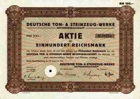 Firma in die Deutsche Ton- & Steinzeug-Werke AG. 1934 Sitzverlegung von Berlin nach Krauschwitz (Oberlausitz). Werke in: 1. Münsterberg