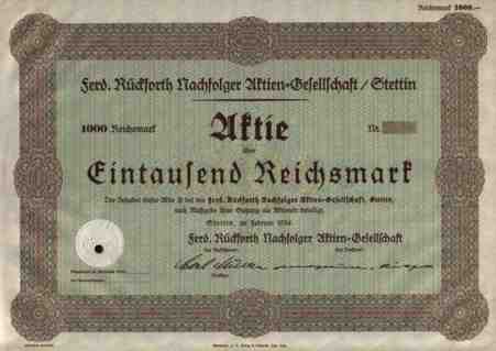 Gegründet am 12.11.1912 unter Übernahme der seit 1742 bestehenden OHG Ferd. Rückforth Nachf., Stettin. Betrieb einer Weinbrennerei und Likörfabrik. Herstellung von Likören, Weinbränden, Rum, Arrak, Branntweinen, Fruchtsäften. Vielfältige (1943: 22) Beteiligungen, meist im Brauereibereich, u.a. an der 1. Aktien-Brauerei Schoenbusch, Königsberg (Pr), 2. Aktiengesellschaft Brauerei Ponarth, Königsberg (Pr), 3. Stettiner Bergschloßbrauerel Aktiengesellschaft, Stettin, 4. Stettiner Brauerei Aktiengesellschaft "Elysium", Stettin. Großaktionäre: Treuhand- und Verwaltungs-Aktiengesellschaft (Familie Rückforth), Stettin (Majorität). Sitzverlagerung nach Heidelberg (Immobilienholding).
