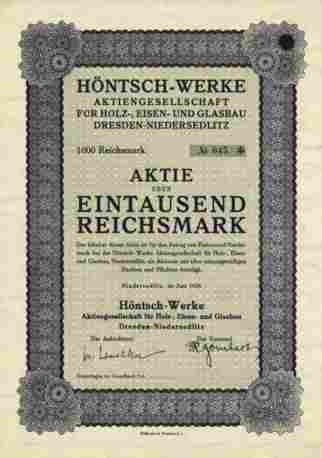 Großaktionär bis 1945: Georg Höntsch sen. (97%). 1946 VEB Holz-, Stahl- und Glasbau, 1969 VEB Metalleichtbaukombinat Werk Dresden, 1990 Sächsischer Gewächshaus- und