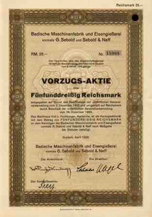 | Badische Maschinenfabrik & Eisengießerei vormals G. Sebold und Sebold & Neff, VZ | 35 RM | Art.Nr. 9312 |