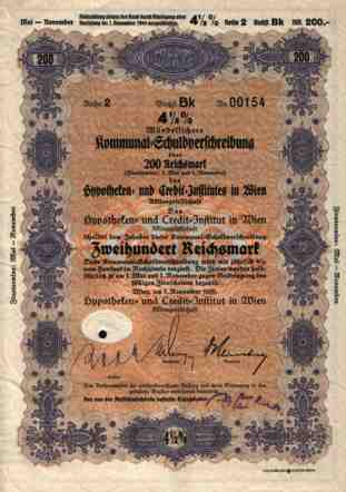 Verkehrsunternehmungen und öffentliche Arbeiten. Ab Mai 1939: Hypotheken- und Credit-Institut in Wien AG und seit Mai 1941: Hypotheken-und Credit-Institut AG.