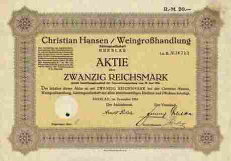 Gegründet am 10.8.1921. Erwerb und Fortführung der Firma Christian Hansen, Weingroßhandlung. Breslau,