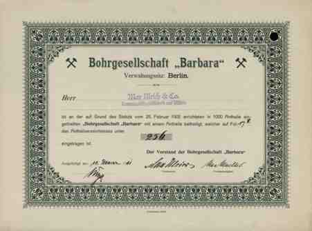 | Gegründet am 4.3.1905. Bohrgesellschaft Barbara in Höxter, Westfalen, Verwaltungssitz: Berlin W. 8, Kronenstrasse 11. Vorstand: Max Ulrich (Vorsitzender), Geheimer Kommerzienrat, Hofbankier, Gotha. Mitglieder: u.a. Richard Schulze, Fabrikbesitzer, Nordhausen, Adolf Lammers, Direktor der Vereinigten Werder'schen Brauereien, Werder a.H. Die Bohrungen auf Kali wurden ab November 1905 bei Höxter i.W. vorgenommen, blieben aber ohne Erfolg. |