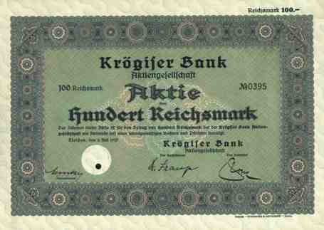 | Gegründet am 1.4.1863. Betrieb von Bank- und Handelsgeschäften aller Art. Sitz der Gesellschaft bis 7.9.1918 in Krögis, danach in Meißen. Firma bis 18.9.1920: Ländlicher Vorschußverein zu Krögis, danach: Krögiser Bank AG. |