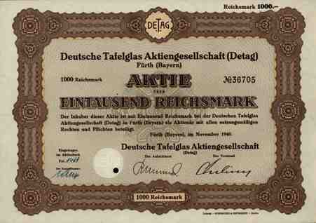 Salin- und Spiegelglasfabriken AG, Fürth (Bay.). Am 16.06.1932 Änderung der Firma in Deutsche Tafelglas AG (Detag). Herstellung von