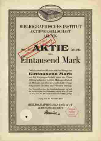 Herausgabe von Lexika, Wörterbüchern, Atlanten und Landkarten. Bereits 1826 durch den Verleger J. Meyer (1796–1856) in Gotha gegründet. 1828 Umzug nach Hildburghausen. 1874 verlegte der Sohn Herrmann Meyer den Sitz des Verlages nach Leipzig. Am 4. September 1880 erschien im Verlag erstmals das »Vollständige orthographische Wörterbuch der deutschen Sprache« von Konrad Duden (1829–1911). 1910 wurde auf einem Grundstück zwischen Gerichtsweg, Täubchenweg, Perthesstraße und Frommannstraße, das H. Meyer schon 1871 kaufte, nach einem Entwurf des Leipziger Architekten Max Pommer (1847–1915) das neue Verlagsgebäude erbaut. 1946 wurde der Verlag in Leipzig ins Volkseigentum überführt und arbeitete bis Anfang der 1990er Jahre als »VEB Bibliographisches Institut«. 1953 Sitzverlegung nach Mannheim, 1984 Fusion mit der F. A. Brockhaus GmbH, Wiesbaden. Marken: Brockhaus, Duden und Meyer. Seit 1989/90 auch wieder Zusammenarbeit mit dem ehemaligen Stammhaus in Leipzig. Dekorativer Eigendruck mit Abb. des Verlagsgebäudes in Leipzig.