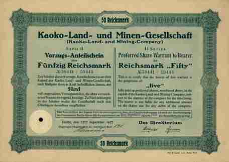 Gesellschaft. 1932 wurde ein Interessenvertrag mit der Schantung Handels-AG abgeschlossen. Dieser bezweckte die Durchsetzung der Besitzansprüche der Kaoko-