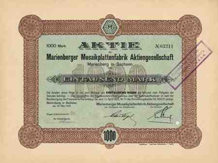Erzeugung und Vertrieb von Fußboden- und Wandplatten und verwandten Erzeugnissen. Erzeugnisse im Werk Marienberg: Steinzeugplatten (Mosaikplatten) für Fußböden; Werk Broitzem (während des Krieges stillgelegt): glasierte Wandplatten aller Art. Gegründet 1890 als oHG. 1896 wurde die Firma in eine GmbH und am 17.6.1907 in eine AG umgewandelt. Sitz der Gesellschaft war bis 8.5.1934 in Marienberg (Sachs.), danach in Broitzem. Besitztum um 1945: Stammfabrik Marienberg (Sachsen) und Werk Broitzem bei Braunschweig (Leitung und Verwaltung des esamtunternehmens). Beide Werke waren mit modernen Brennöfen und allen erforderlichen keramischen Maschinen, wie Mahltrommeln, Kollergängen, Siebzylinder, Pumpen und Pressen ausgestattet. Nach 1945 Sitzverlegung nach Broitzem. Nach der Währungsreform stieg das Broitzemer Werk zu einem bedeutenden Fliesenhersteller in der Bundesrepublik Deutschland auf. Sein Marktanteil an Wandfliesen betrug 1958 ca. 14% und an Bodenfliesen ca. 4 % der deutschen Produktion. 1966 Eröffnung des Konkursverfahrens, 1984 Anschlußkonkursverfahren mangels Masse eingestellt, 1988 von Amts wegen gelöscht, 1995 Nachtragsabwicklung.