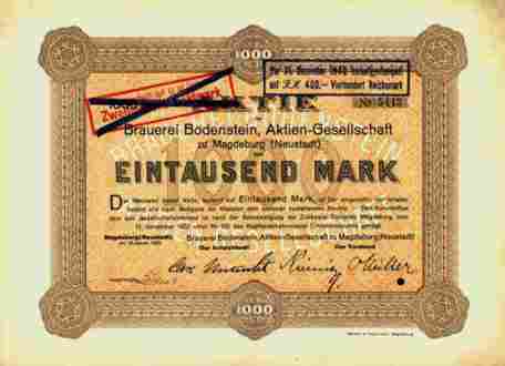 Verwertung durch Verkauf. Gegründet 1823, als AG 1886. Firma bis 1924: Brauerei Bodenstein AG, danach: Brauerei Bodenstein, AG zu Magdeburg. Grundbesitz (1943):