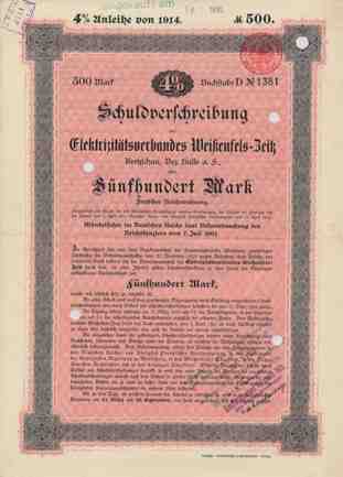 | Elektrizitätsverband Weißenfels Zeitz, 4% TSV | 500 Mark, Lit.D | Art.Nr. 8646 |
