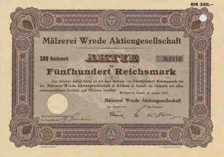 | Produktion von Malz sowie Lebens- und Futtermittelherstellung. Gegründet am 7.3.1889 unter der Firma Mälzerei AG vormals Albert Wrede. Laut Hauptversammlungsbeschluß vom 18.1.1939 Änderung der Firma in Mälzerei Wrede AG. Beteiligungen (1943): Malzfabrik Rheinpfalz AG, Pfungstadt (Hessen). Firmenmantel: 1951 verlagert nach Hamburg, 1952 nach Frankfurt/Main, ab 1966 GmbH. |