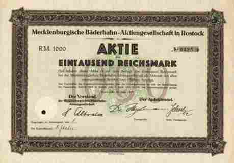 Gründeraktie. Gegründet am 28.2.1925. Betriebseröffnung am 1.7.1925. Betrieb einer Kleinbahn (Rövershagen - Graal-Müritz, 10,3 km). Betriebsführung: Firma Lenz & Co. in Berlin. Die