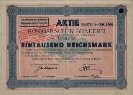 Gegründet am 3.3.1900, unter Übernahme der 1884 gegründeten Bierbrauerei Jos. Thillmann, Königsbacher Brauerei in Koblenz.