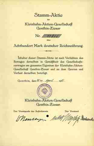 Kleinbahn von Güsen nach Jerichow. Nach Übernahme der Ziesarer Kleinbahn-AG laut Generalversammlung vom 28.3.1923 sind